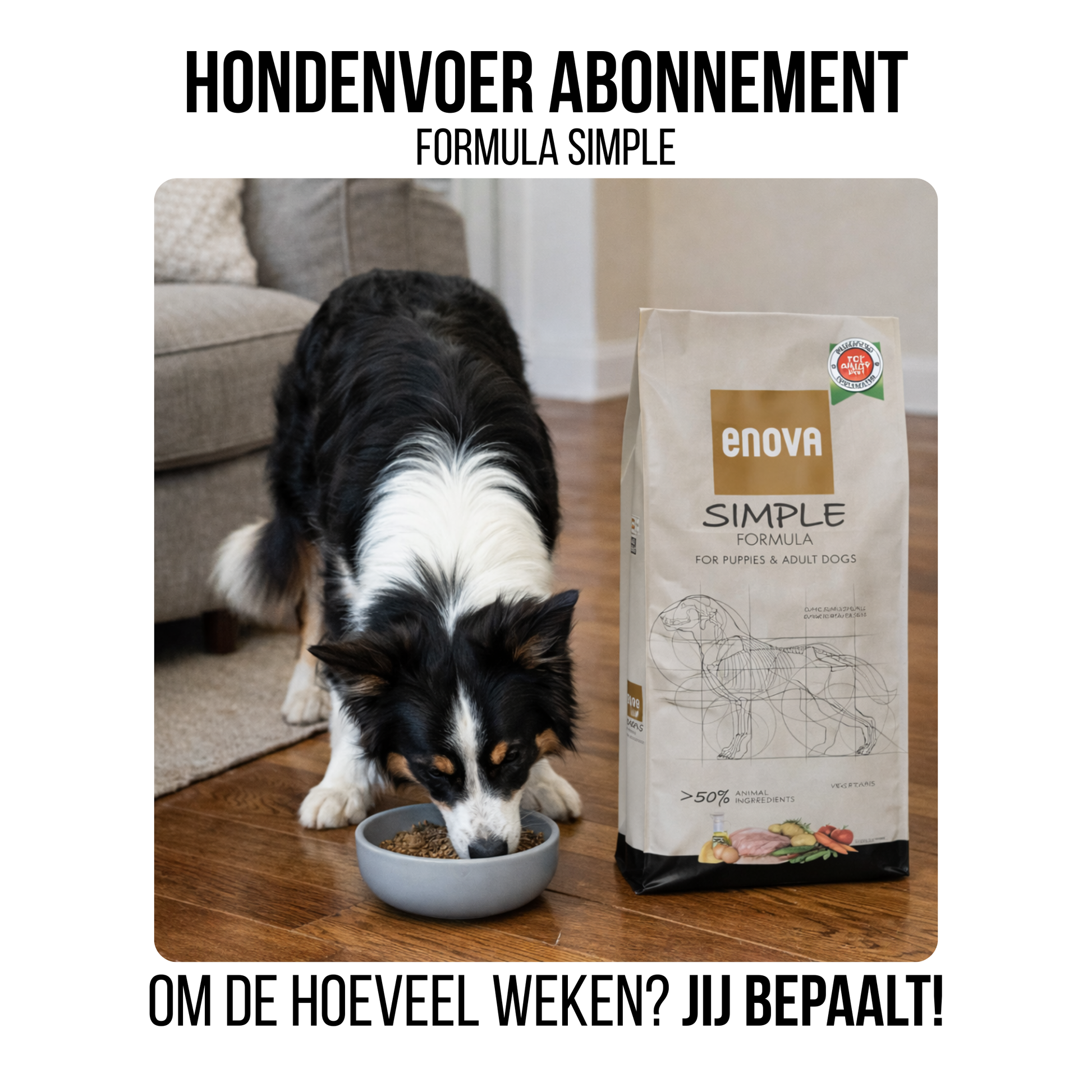 Met het Enova Formula Simple hondenvoer abonnement kies je voor gemak en continuïteit. Je ontvangt elke levering een 12 kg zak, afgestemd op het verbruik van jouw hond. Zo hoef je niet steeds opnieuw te bestellen en weet je zeker dat je hond altijd hetzelfde vertrouwde, energierijke voer krijgt.