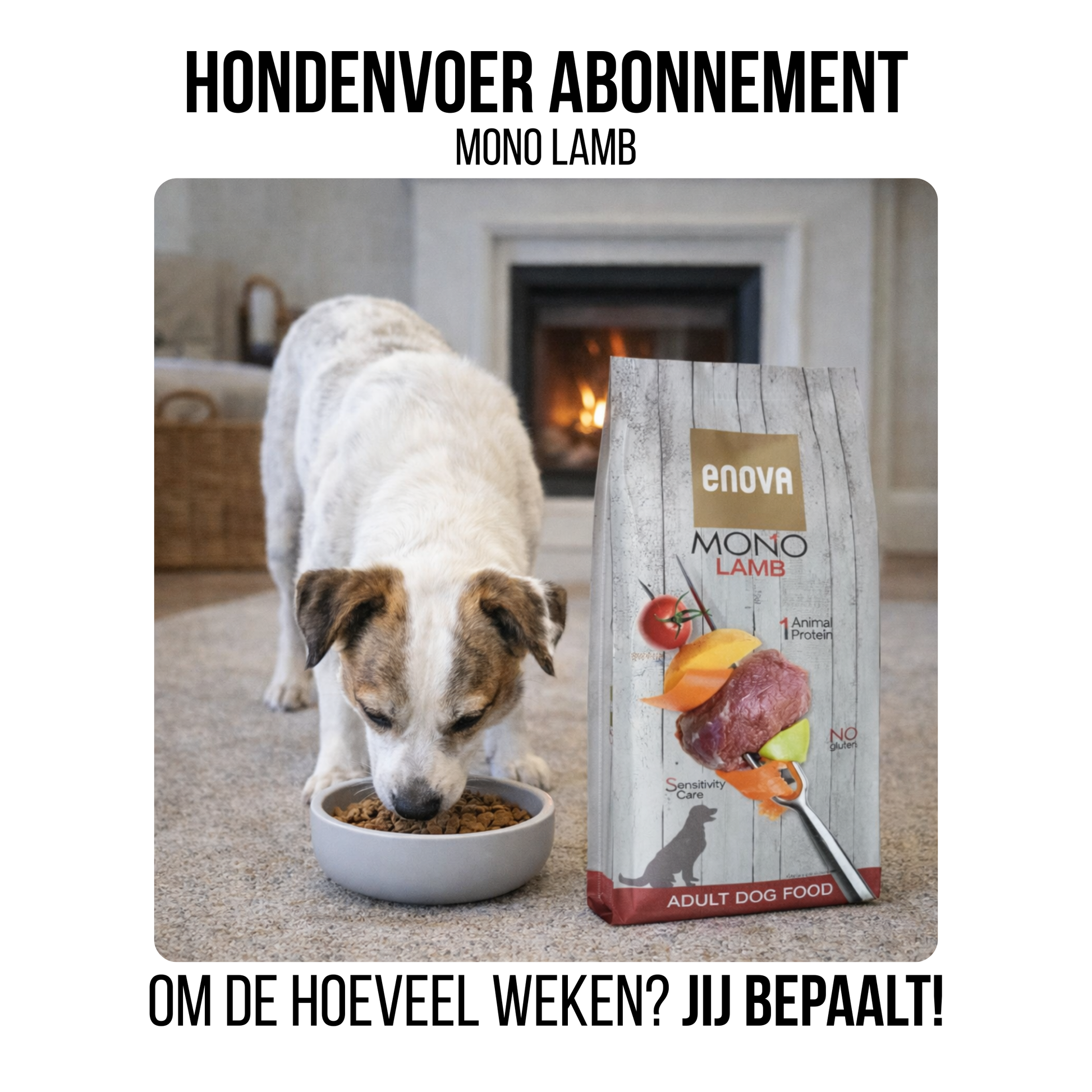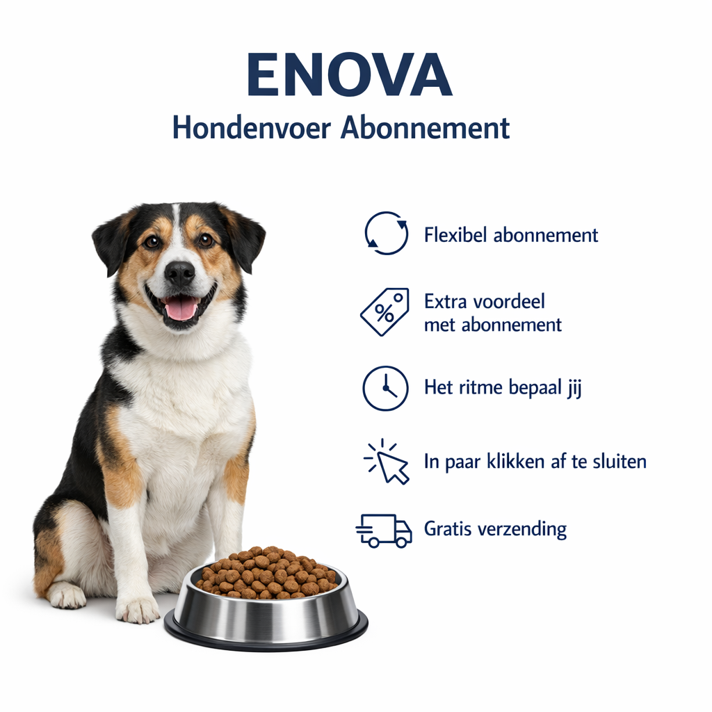 Met het Enova Mono Lamb hondenvoer abonnement kies je voor gemak en continuïteit. Je hond krijgt altijd hetzelfde vertrouwde voer, op vaste momenten thuisbezorgd. Zo voorkom je stress, last-minute aankopen en lege voerbakken, terwijl je zeker weet dat je hond dagelijks geniet van smaakvol en goed verdraagbaar hondenvoer.